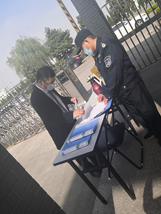 保安經理到項目上檢查工作被保安員攔下量測體溫登記
