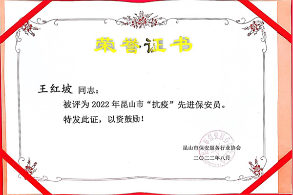 恭喜優(yōu)派克集團王紅坡同志榮獲昆山市“抗疫”先進(jìn)保安員稱號
