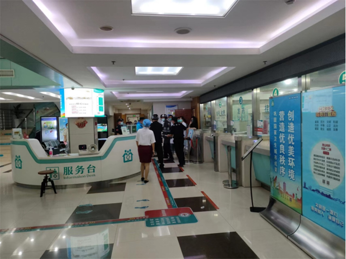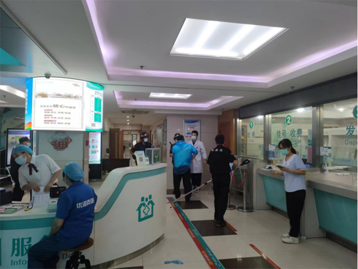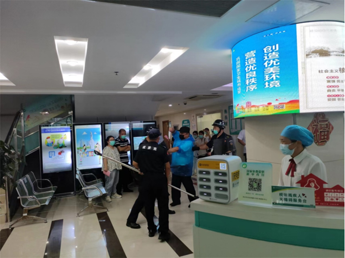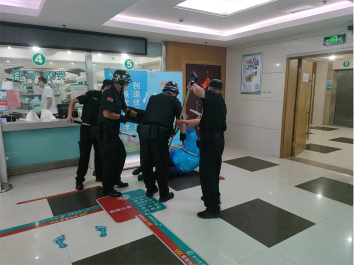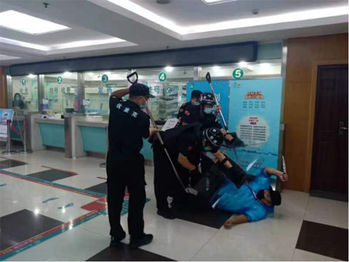 演練現(xiàn)場(chǎng)模擬一暴恐分子持刀強(qiáng)行闖崗,執(zhí)勤保安迅速報(bào)保衛(wèi)科及分管領(lǐng)導(dǎo),并撥打110報(bào)警電話,同時(shí)疏散就醫(yī)群眾和工作人員。